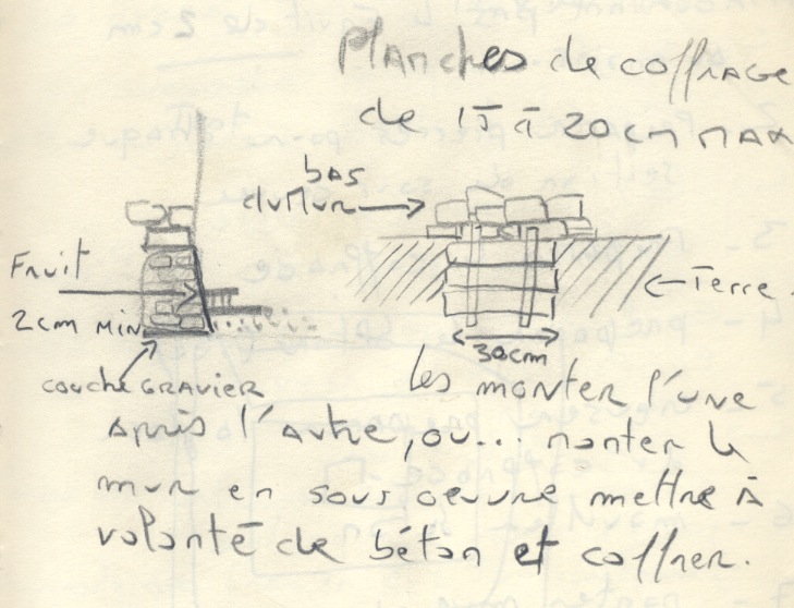 Nous avons cherché conseil auprès d’amis, sur des forums etc… le conseil revenant le plus souvent étant de construire une ceinture de béton de ciment armé à l’intérieur, une sorte de banquette de 80 cm de haut sur 40cm sur tout le pourtour de la grange. Ca ne nous convient pas pour de multiples raisons :
