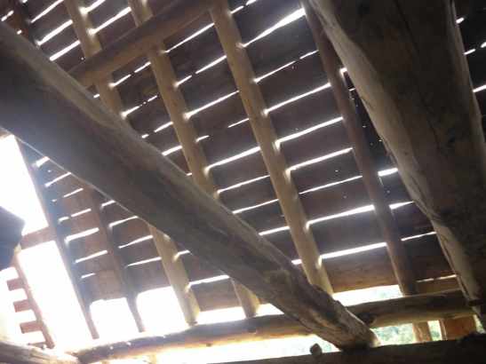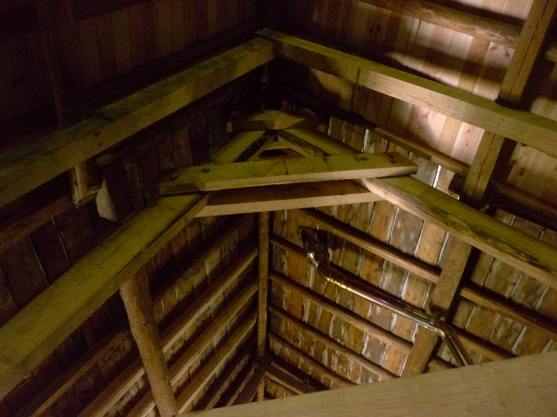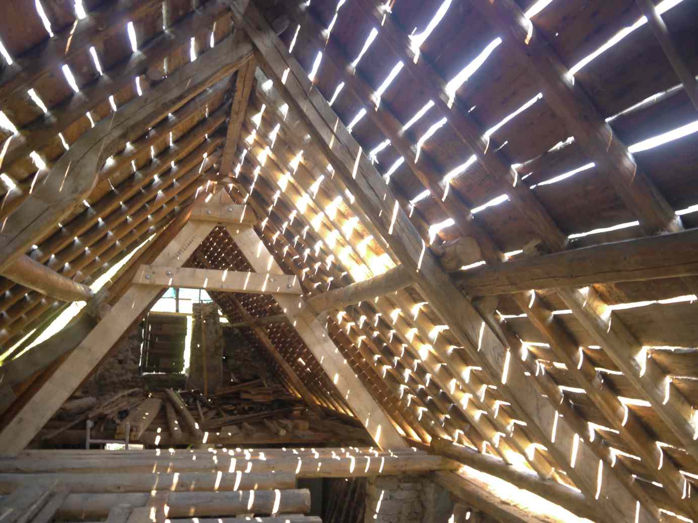 Chevrons et pannes vus de l’intérieur. Les deux angles visibles de chaque chevron ont été cassés à la tronçonneuse puis rabotés.