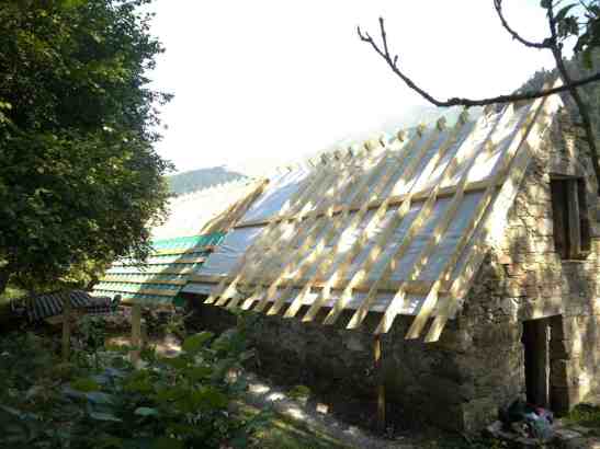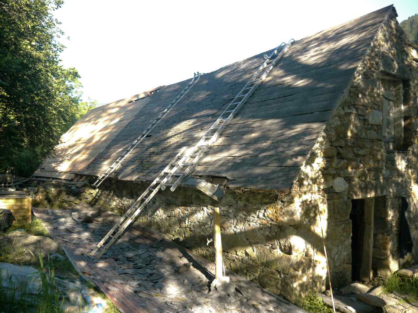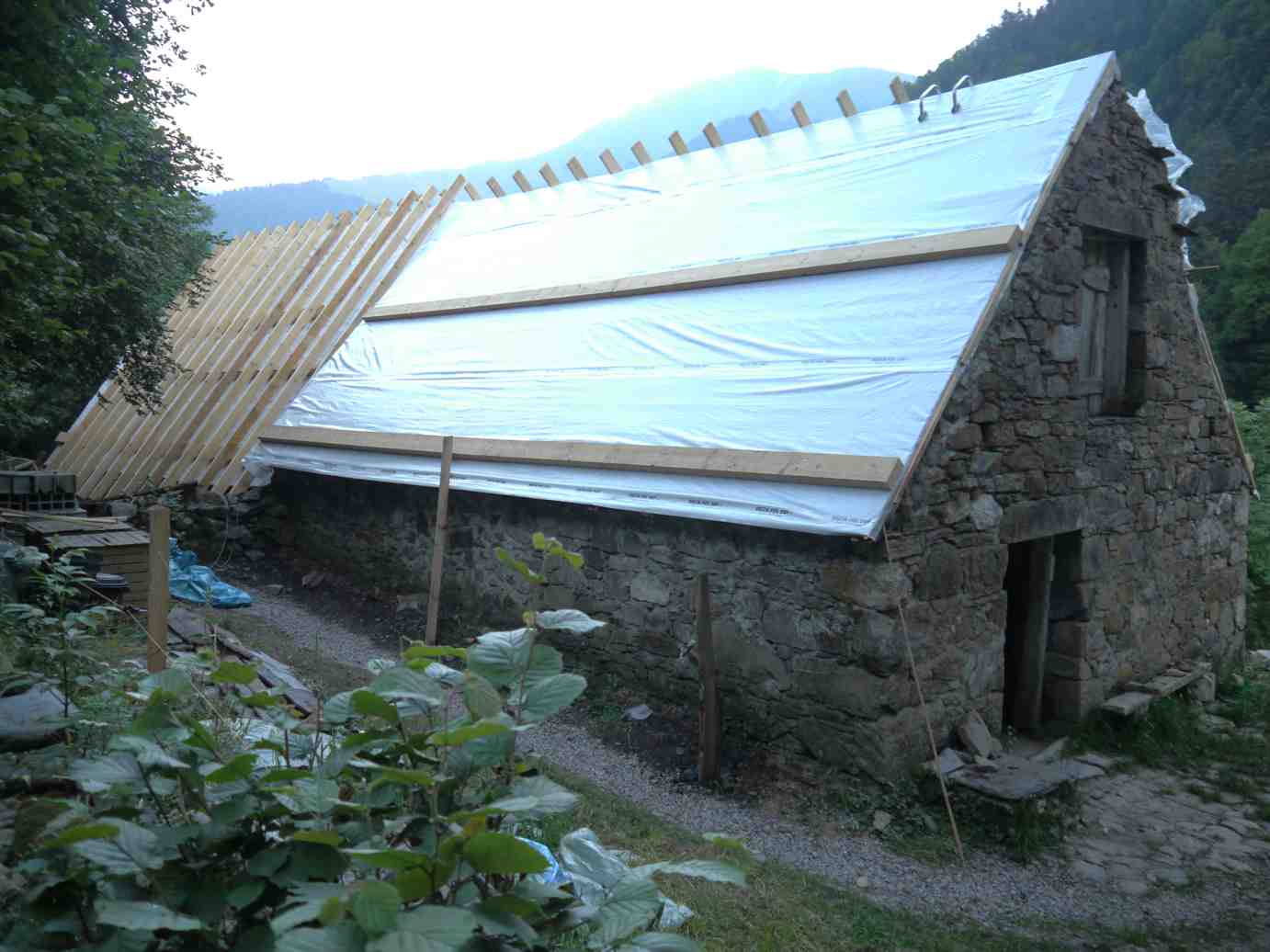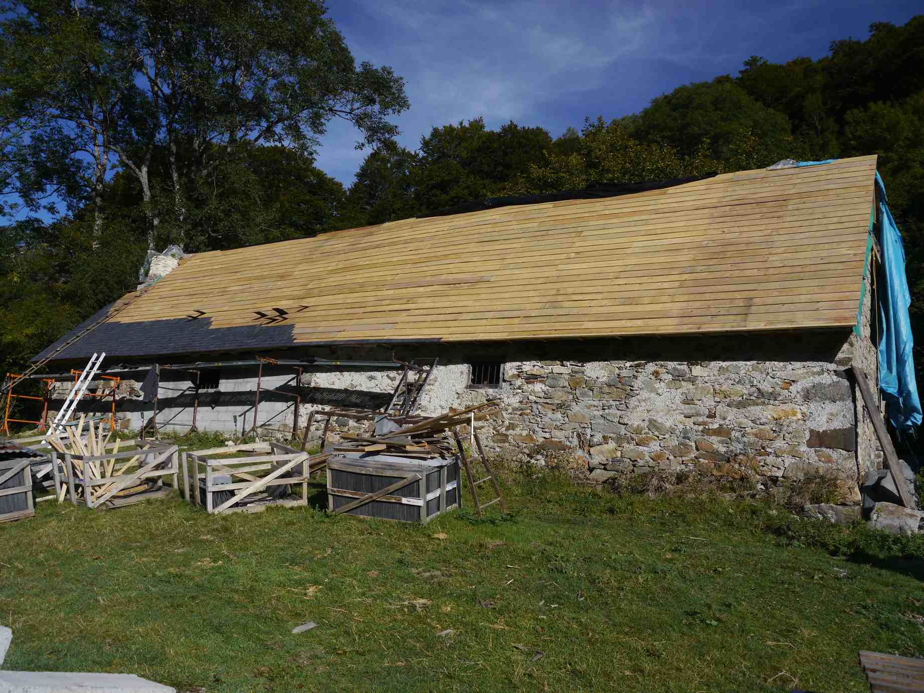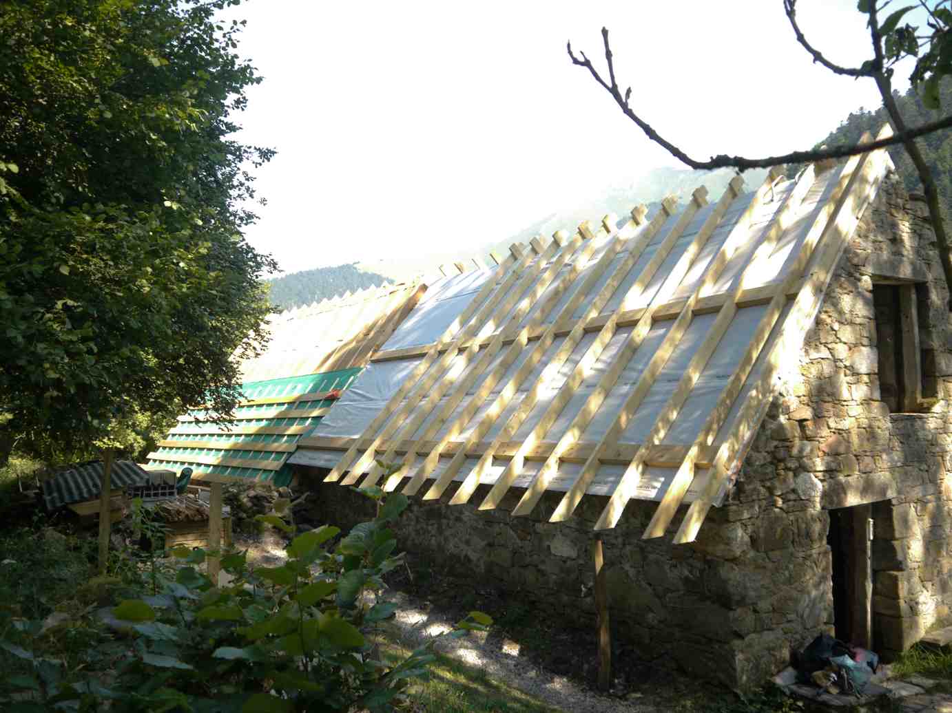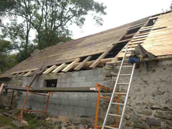 Nous avons décidé de refaire le toit dont une partie était encore en ardoise et l’autre restaurée en tôle ondulée, le tout en très mauvais état avec des fuites qui ont endommagées des parties de la charpente, dont dans le détail sont à reprendre: une ferme, 4 chevrons, une panne sablière, une panne et bien entendu la volige.