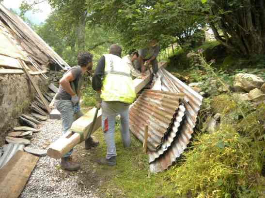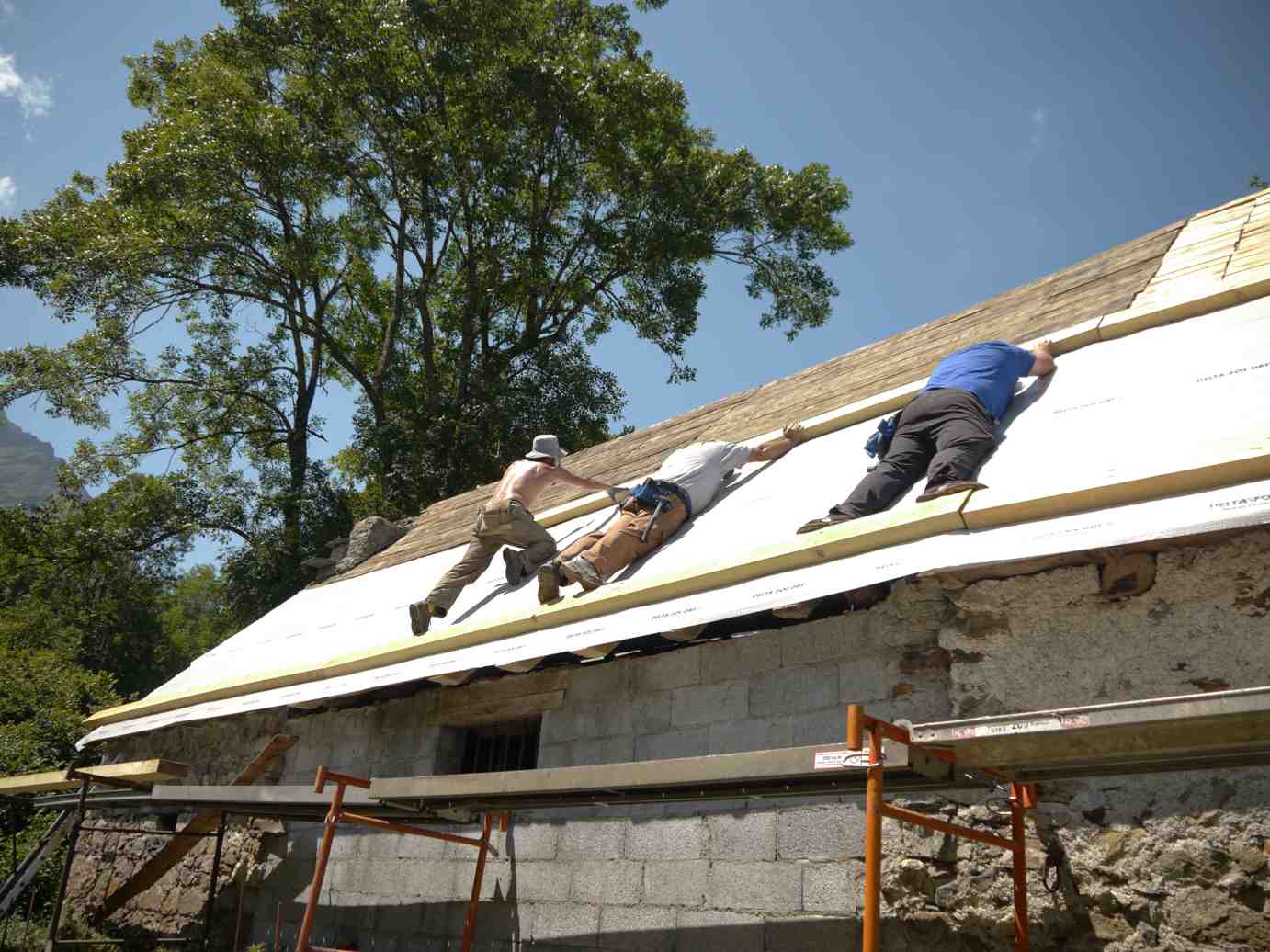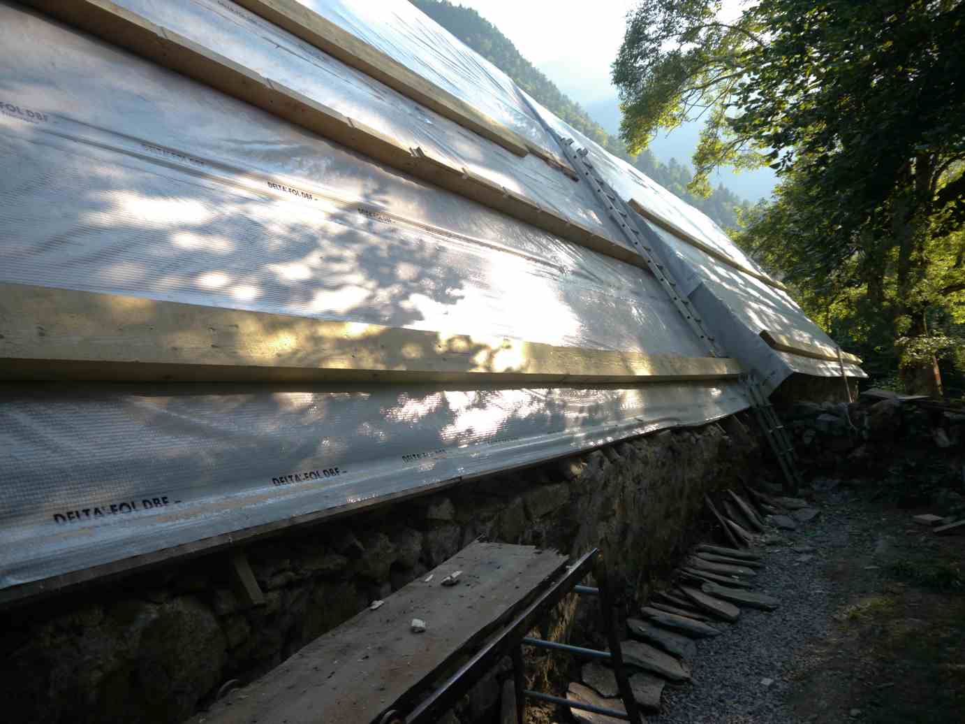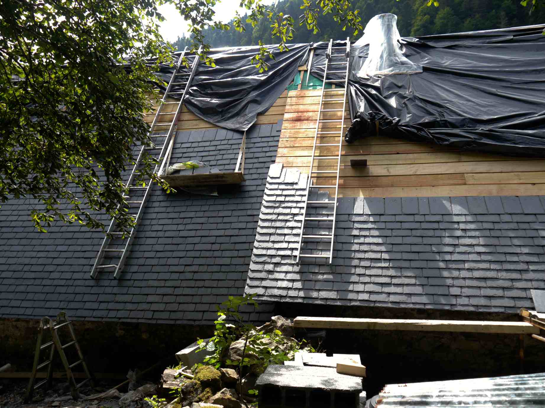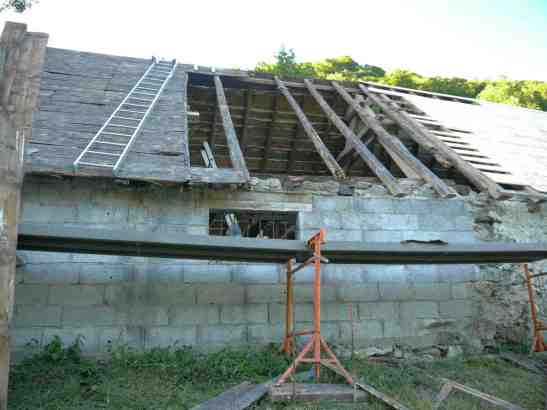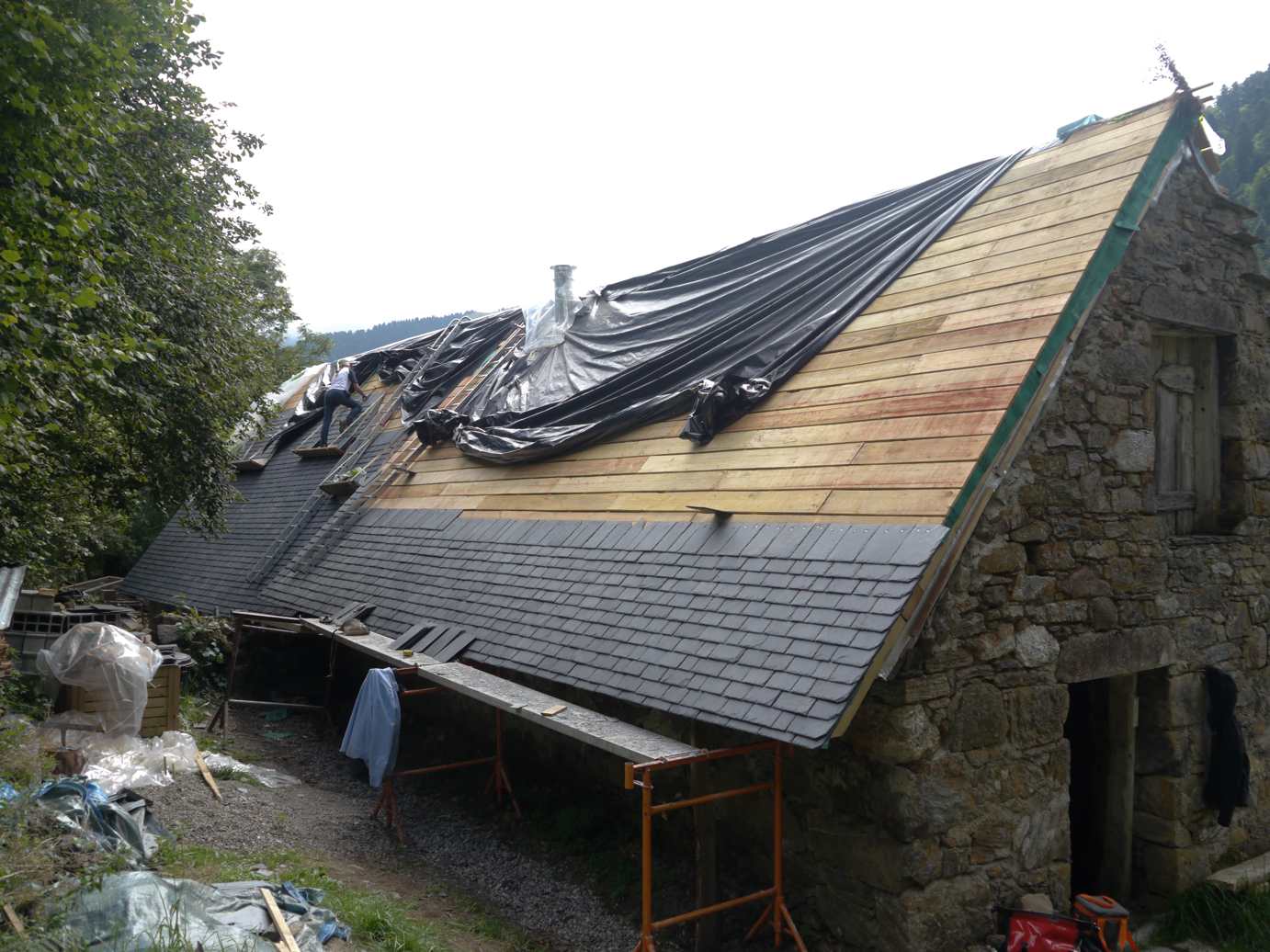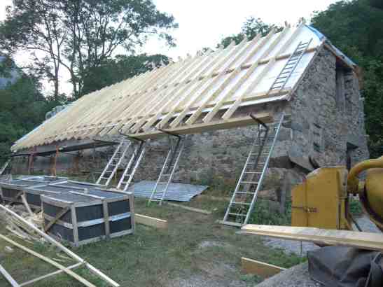 Nous avons décidé de refaire le toit dont une partie était encore en ardoise et l’autre restaurée en tôle ondulée, le tout en très mauvais état avec des fuites qui ont endommagées des parties de la charpente, dont dans le détail sont à reprendre: une ferme, 4 chevrons, une panne sablière, une panne et bien entendu la volige.