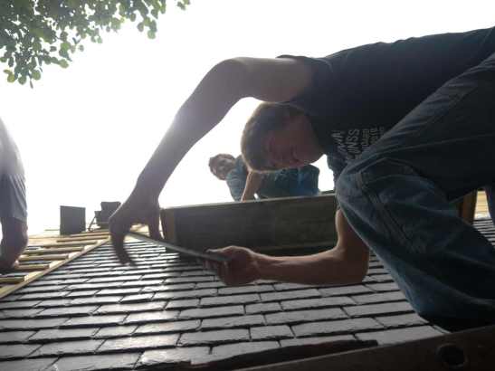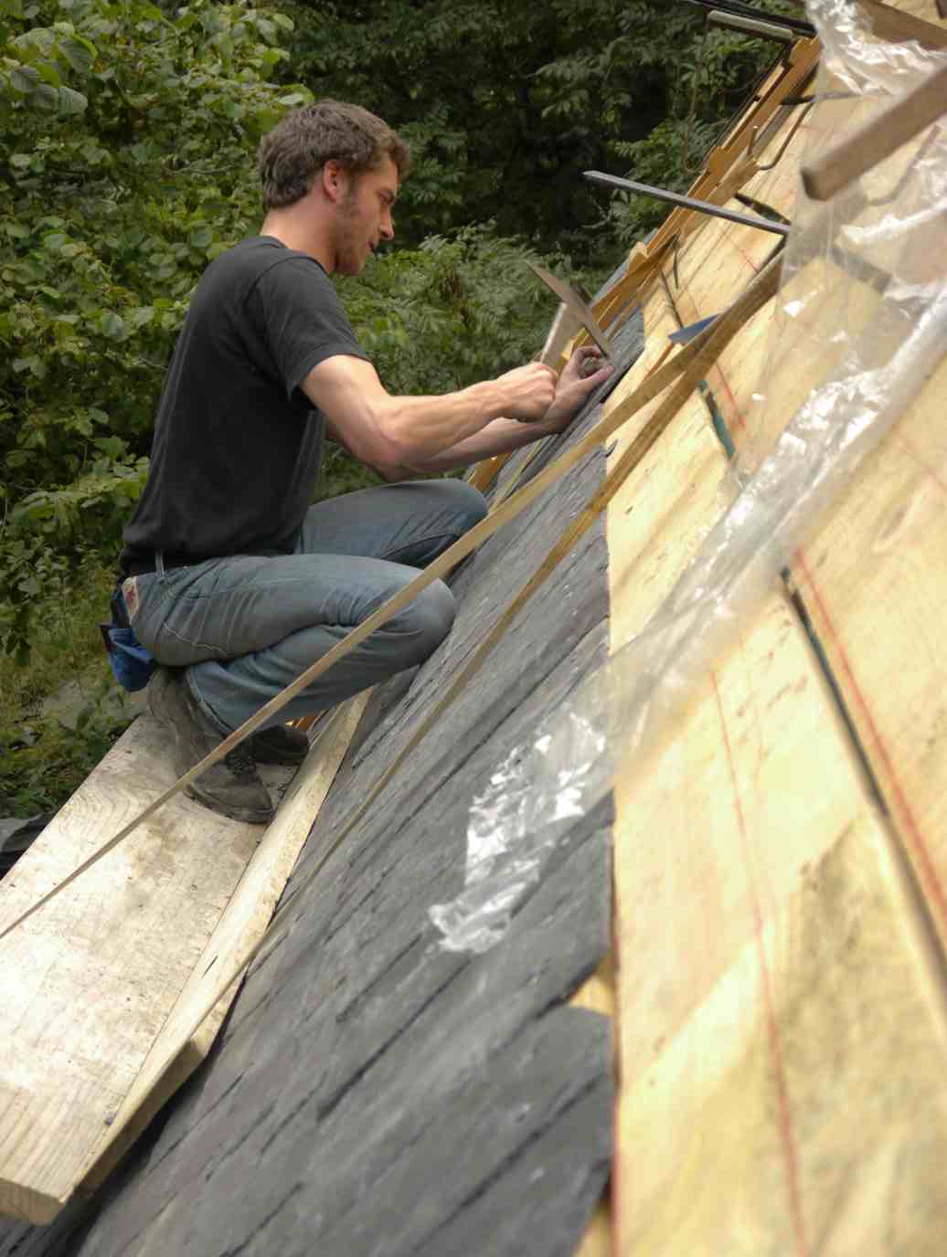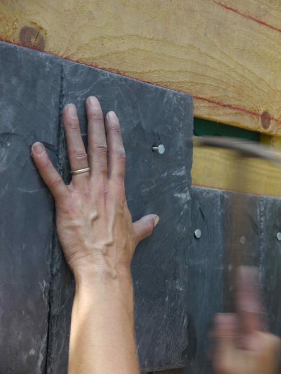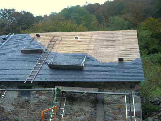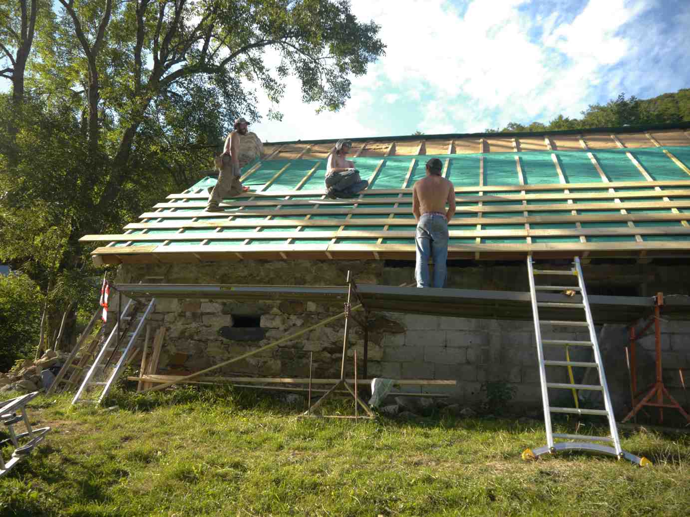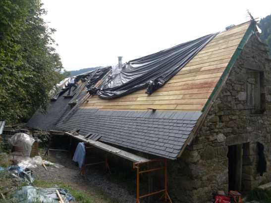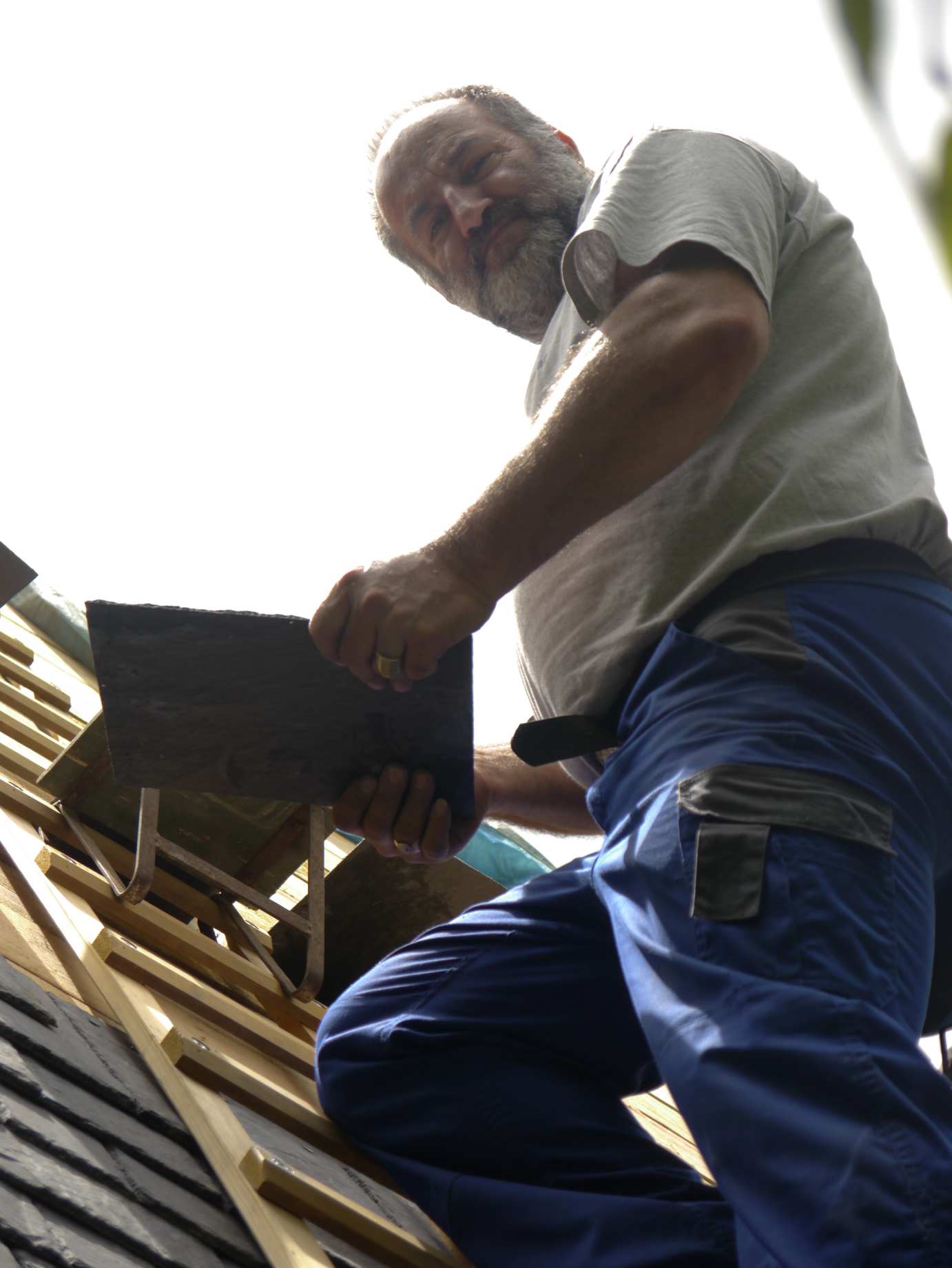 Le premier quart de la couverture ardoise sera posés avec les copains c’est ensuite avec P que nous prendrons en charge les 150m2 restant, avec l’aide plus ponctuelle mais oh combien précieuse d’amis qui nous rejoindrons pour partager quelques journées de travail avec nous. Merci Eric, Raoul, Alain, Maryvonne et Kürsad.