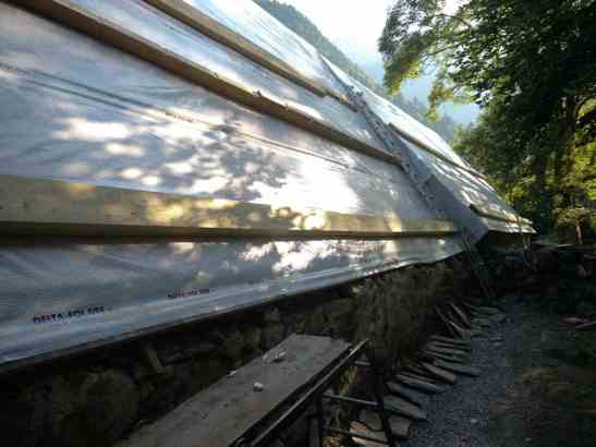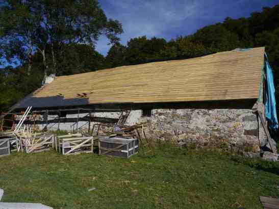 2 jours seront nécessaires pour tailler et mettre en place cette ferme. Aujourd’hui ferme classique fraichement posée et la ferme moisée posée il y a un an se côtoient.