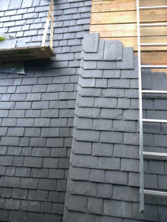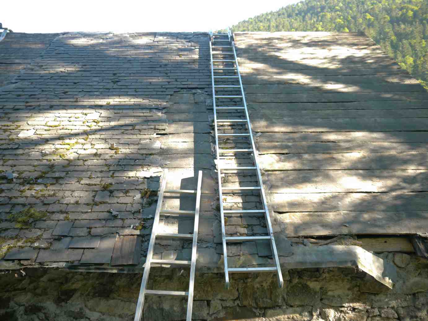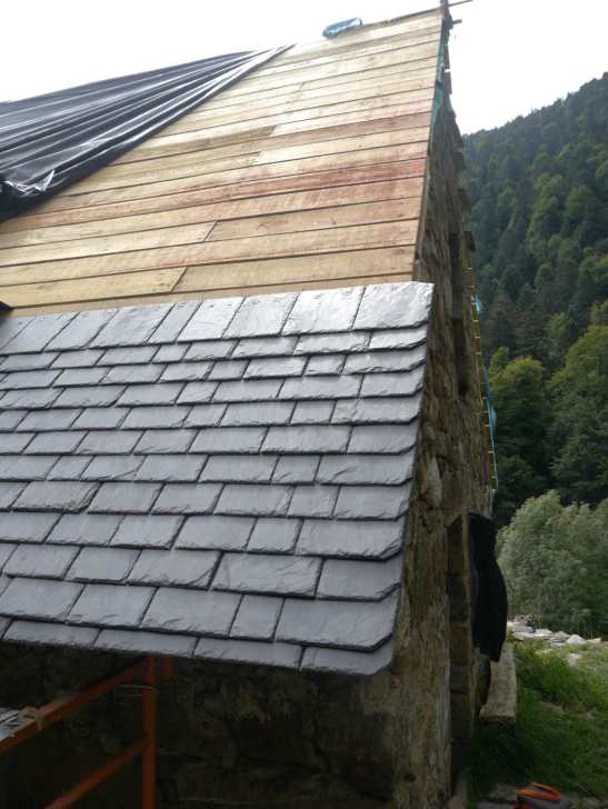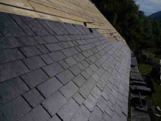 pose des dernières ardoises de faitage coté nord, la volée est allongée de 40 cm pour le futur stockage du bois