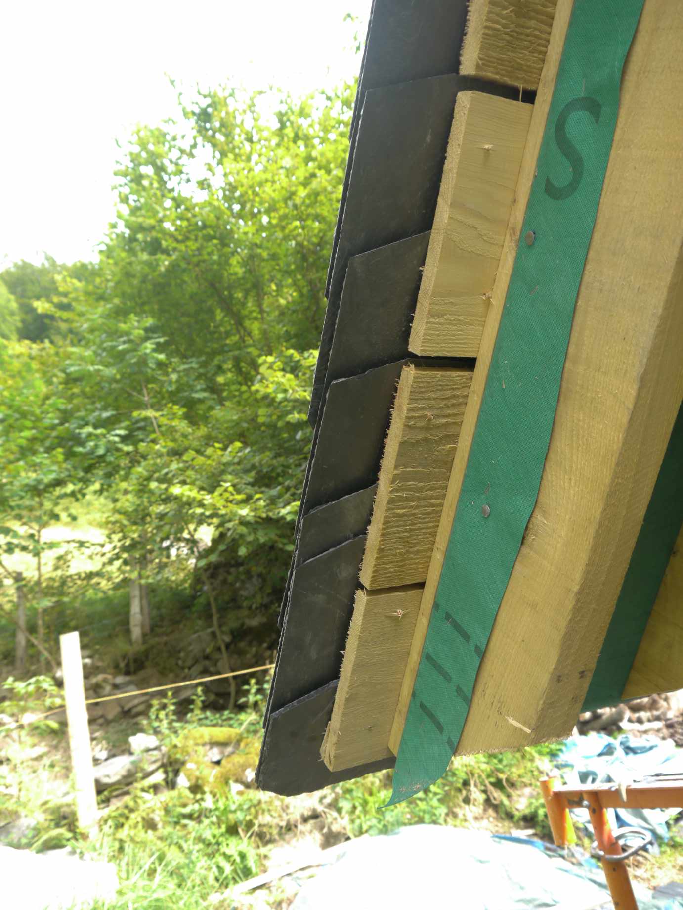Détail d’une rive. On alterne les ardoises de 25cm et de 18 cm de largeur. Les coins inférieurs des ardoises sont écornés à 45° pour que la goutte revienne vers l’intérieur du toit. Le rang inférieur est réalisé en ardoise de 25cm (on a mis de coté les plus épaisses) et est doublé avec une demi 25 en dessous pour solidifier. Le pureau entre nos deux premiers rangs est réduit, au départ c’est une erreur de traçage, mais on s’est vite rendu compte que notre bordée n’en serait que plus solide de ce coté où le toit est particulièrement bas.