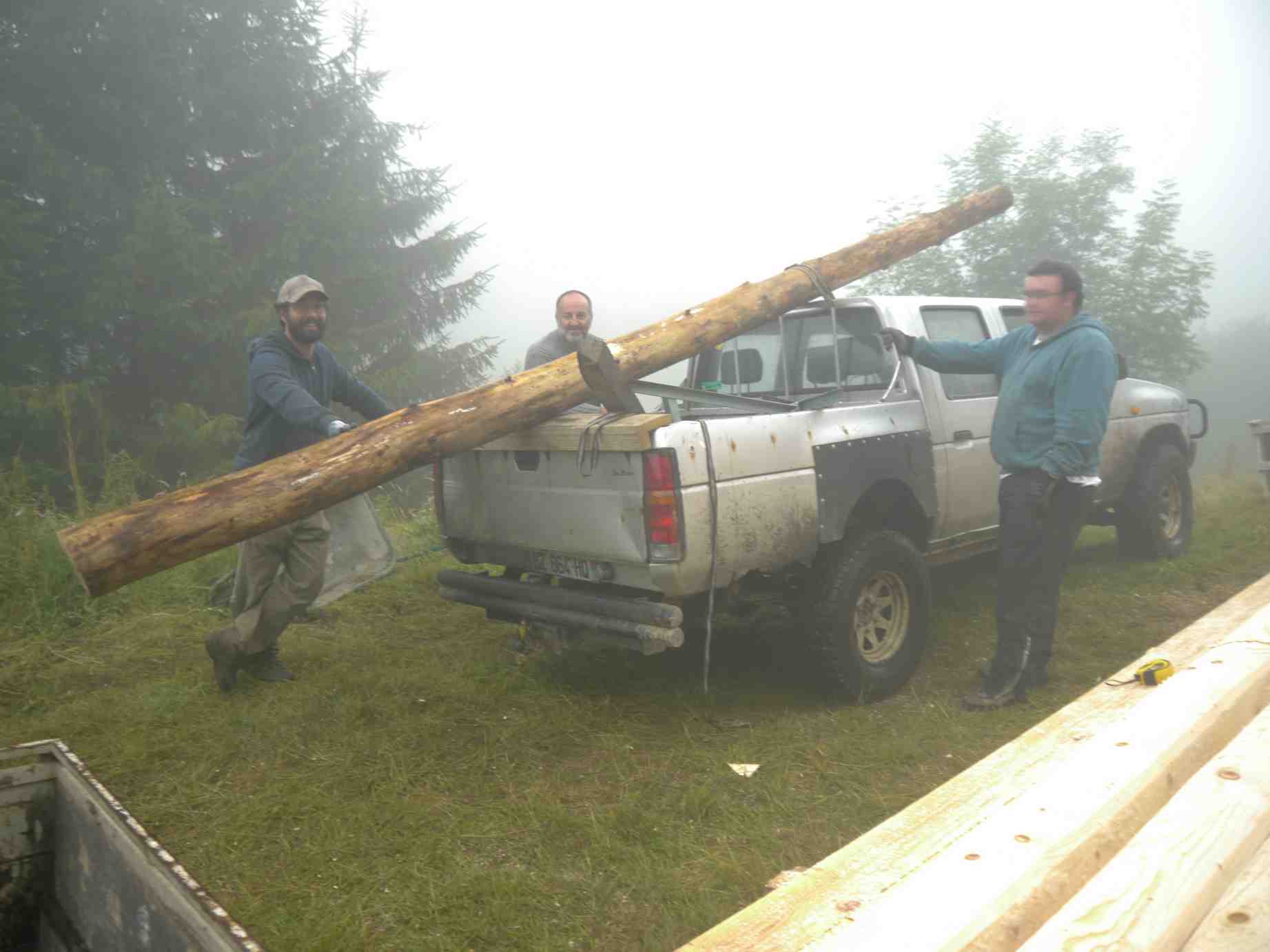 Des amis, un 4×4 et deux heures plus tard la future panne est au pied de la grange ! Un peu de découpe, un traitement et nous avons notre nouvelle panne sablière !