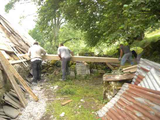 Nous reprenons les chevrons pourris et la panne qui sur la photo sont déjà retirés. En découvrant nous constatons que la sablière est pourrie elle aussi, c’était invisible depuis l’intérieur, et donc je n’avais pas commandé cette pièce de bois….qu’à cela ne tienne, j’ai repéré une bille de sapin de l’autre coté de la vallée…