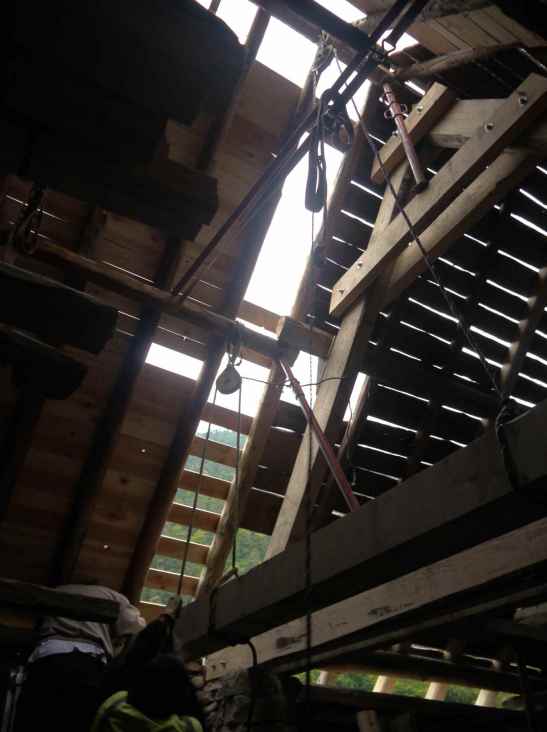 Elle est suspendue par un mouflage afin de « faciliter » sa mise en place. On voit les étayages et renforts sur la charpente en attendant la réparation.
