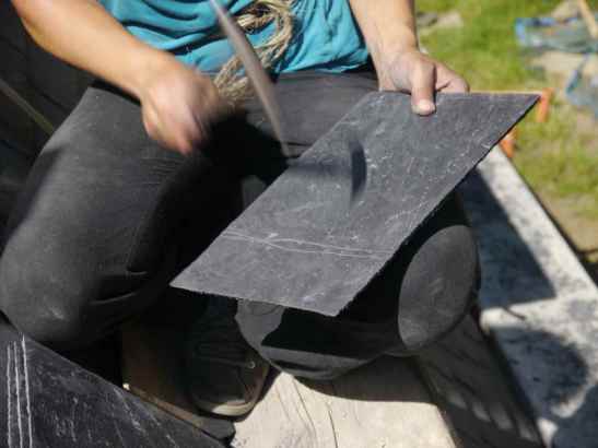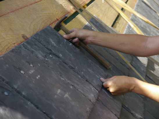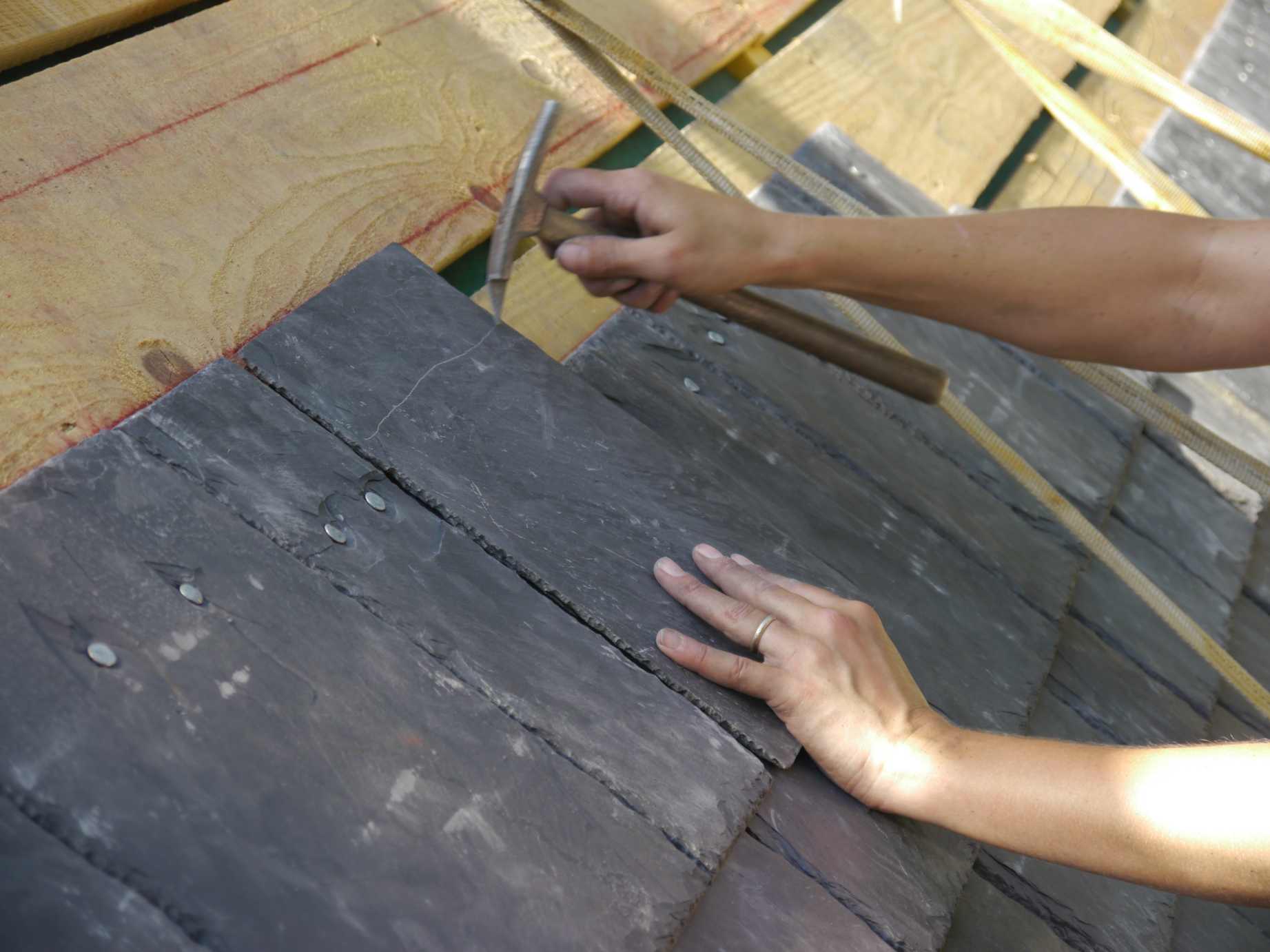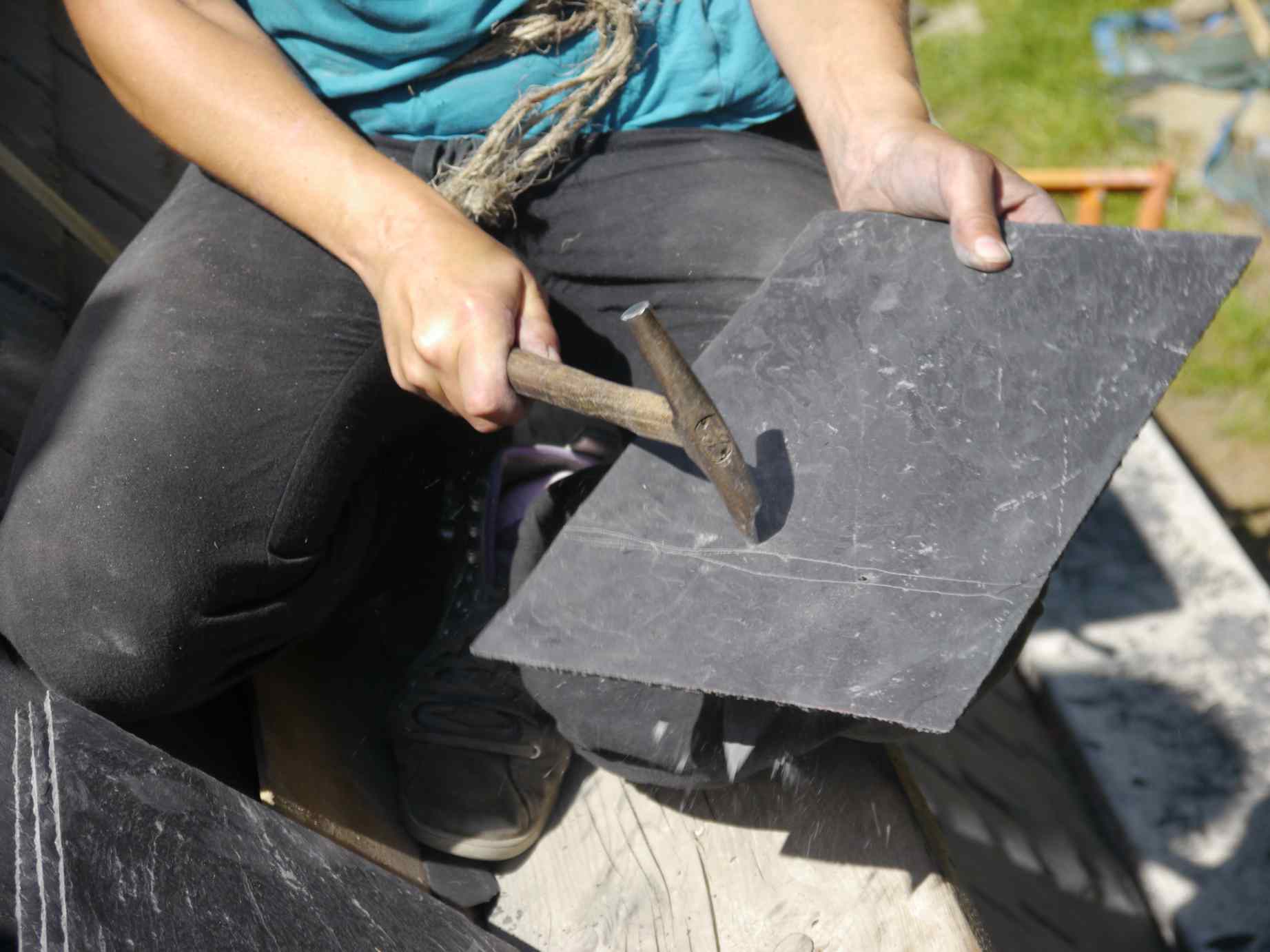 Un coup avec la pointe du marteau pour percer l’ardoise (marteau ici fabriqué sur mesure par Didier pour la propriétaire !). C’est une base de marteau de tapissier).