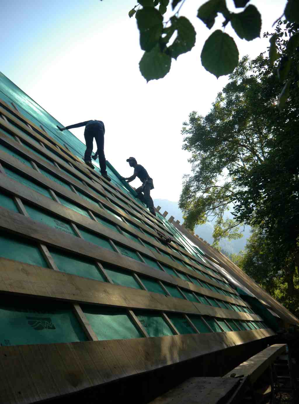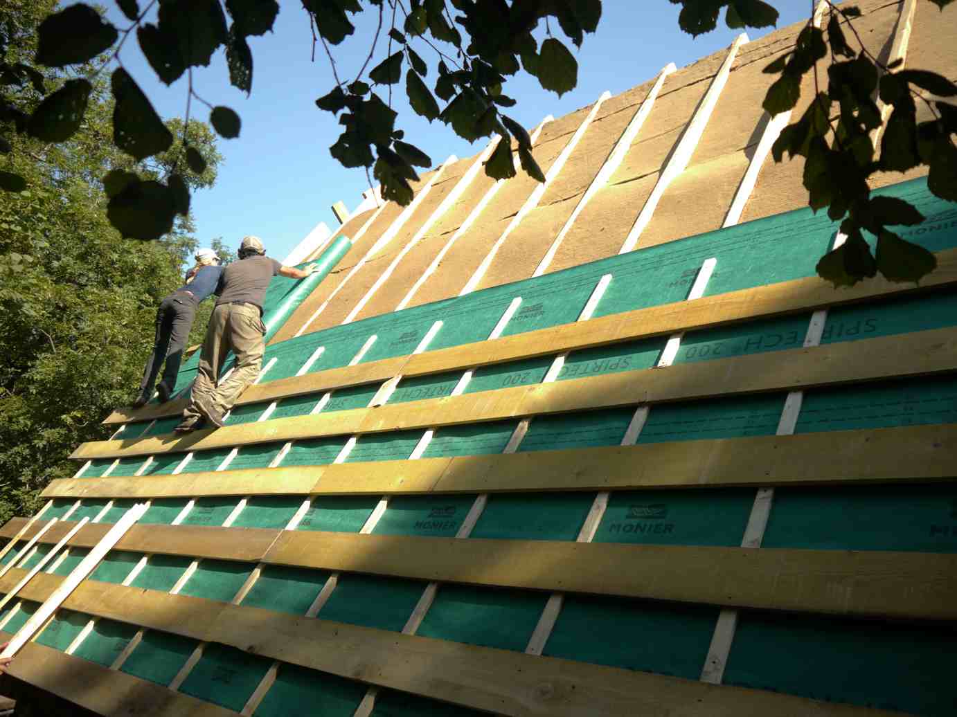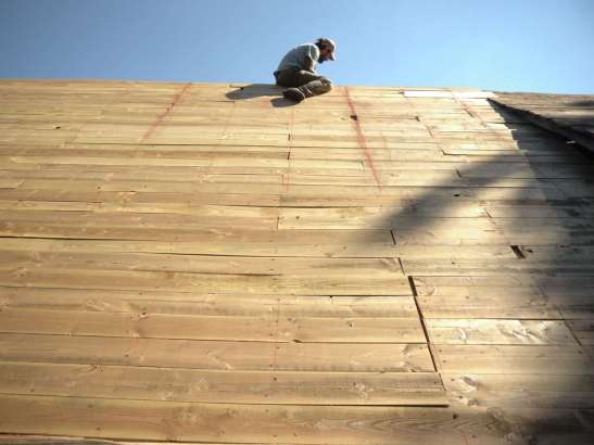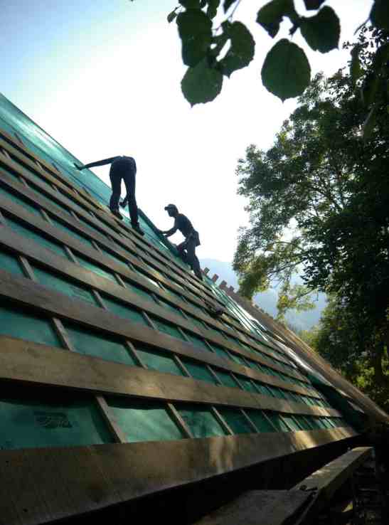 On volige en escalier pour pouvoir monter sans échelle, on voligera les interstices en descendant. La volige est en pin de 18mm d’épaisseur car nous pensions alléger un peu le toit. Un conseil, poser absolument une volige épaisse, de 22mm ou plus. Clouer sur de la 18mm est très difficile, la planche trop fine rebondie à chaque coup de marteau. Exiger aussi une volige propre et sans nœuds. Travailler vite après la pose de la volige car plus elle durcie plus planter les clous devient difficile. Bâcher même par temps sec, aide le bois à conserver son humidité. En dernier recours arroser le toit.