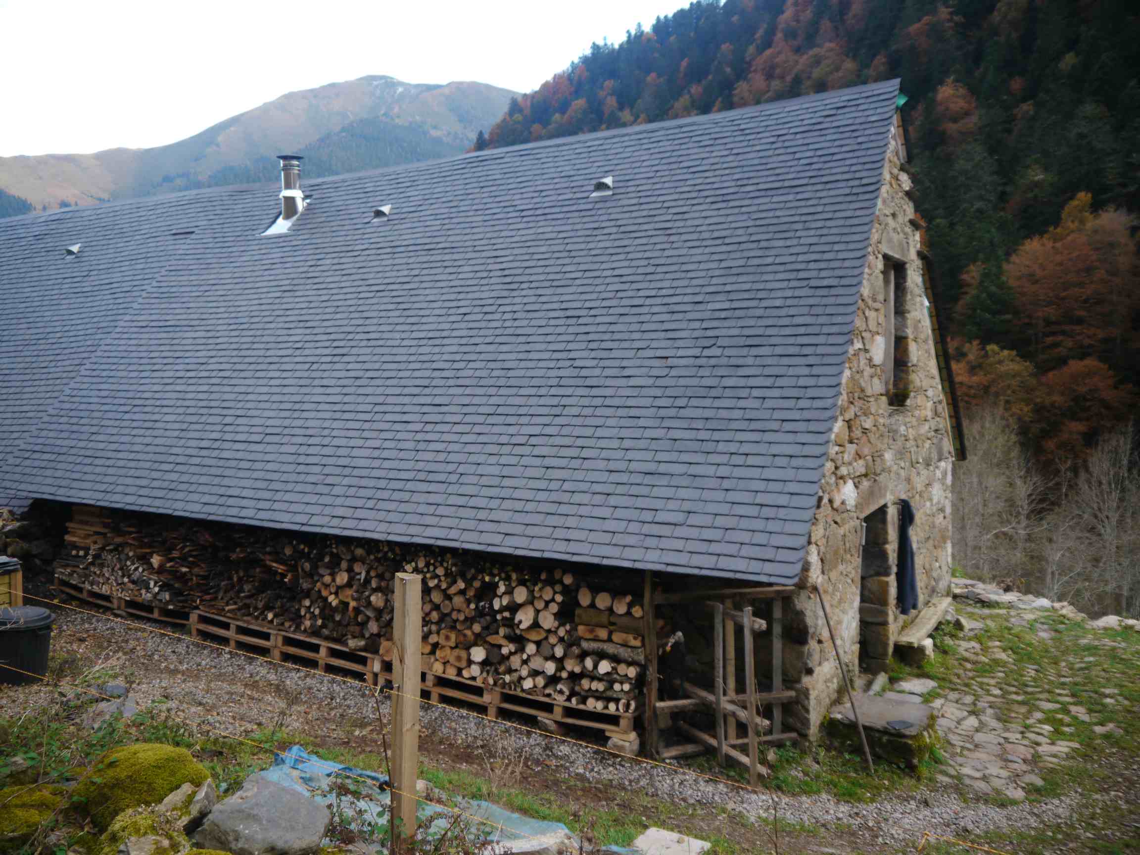 […] pose des dernières ardoises de faitage coté nord, la volée est allongée de 60 cm pour le futur stockage du bois […]
