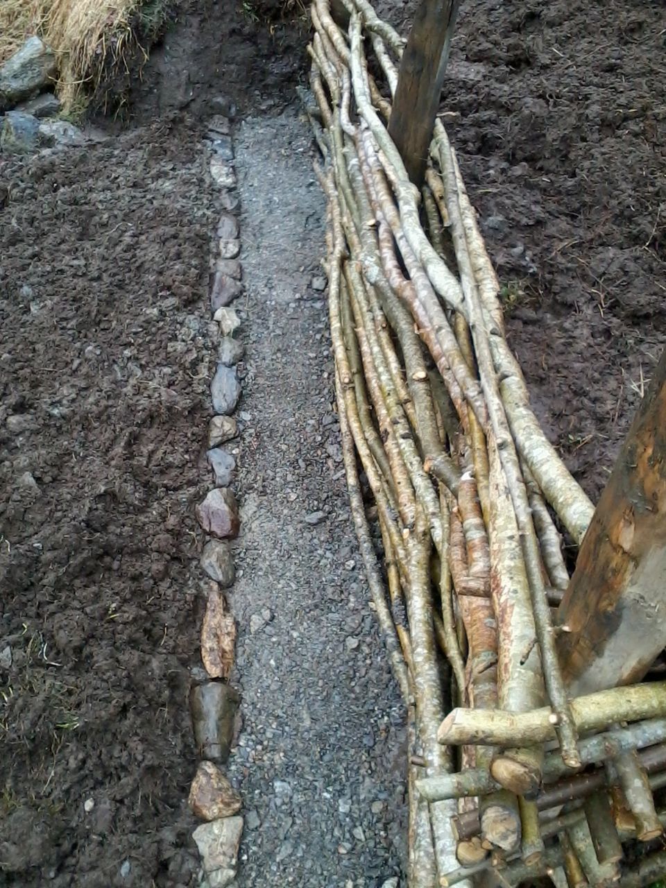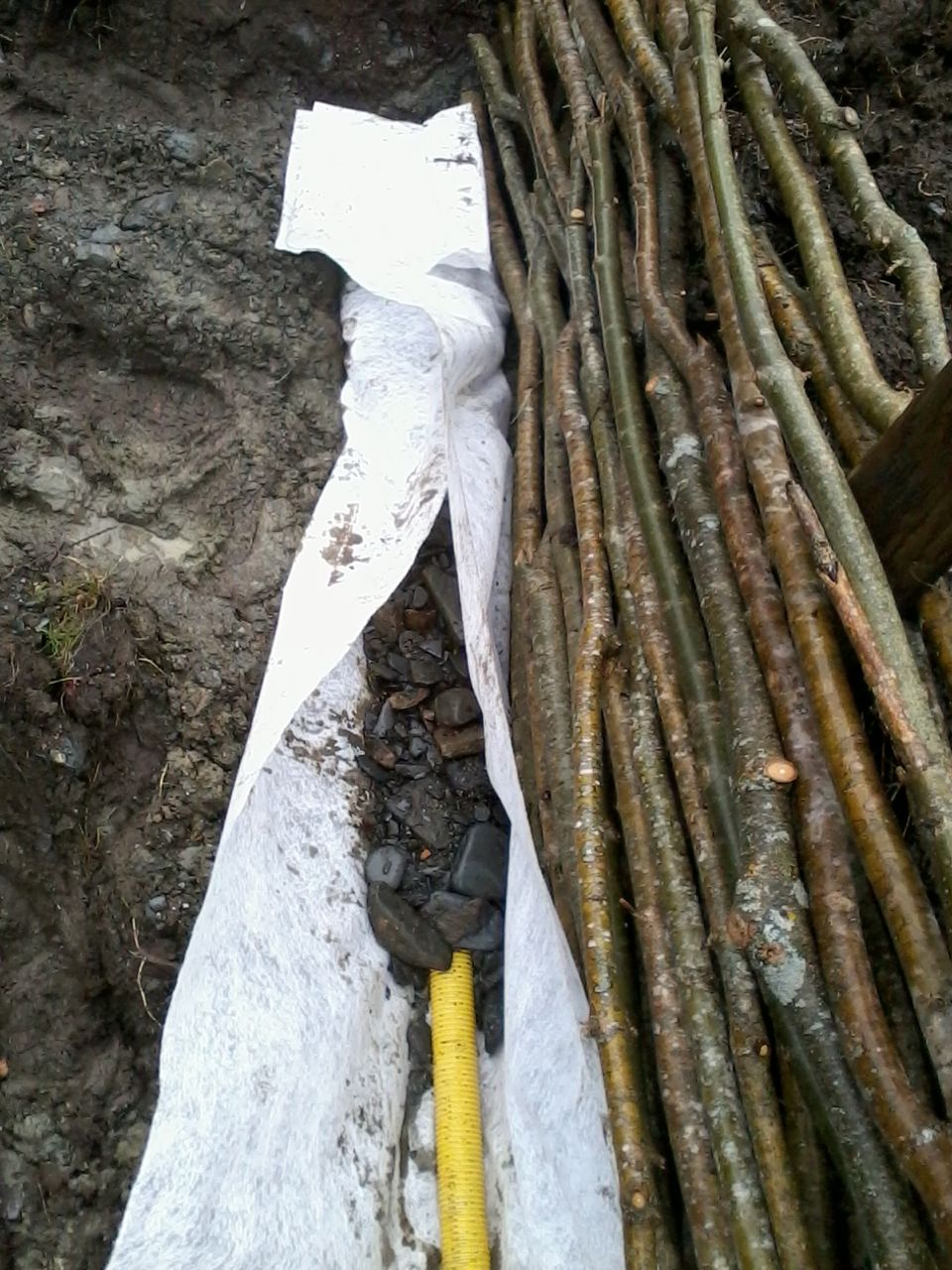 Comme le potager se trouve à un endroit bien arrosé par les résurgences et parfois par les débordements des canaux et cours d’eau lors des crus, un système de canalisations s’impose. Pour éviter que la terre des terrasses ne deviennent des bains de boue, j’ai décidé d’installer un drain agricole le long de chaque terrasse, permettant d’acheminer l’eau vers le canal vertical central. J’ai donc creusé une tranchée au fond de chaque terrasse, dans laquelle j’ai posé un tissu agricole, ensuite le drain agricole que j’ai recouvert de gravier, le tout emballé dans le tissu et recouvert d’une couche de gravier plus fin. Cette installation crée un chemin qui permet d’accéder à la fois aux plantations longées par le drain et à celles sur la terrasse plus haut.