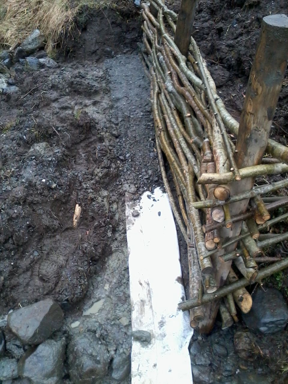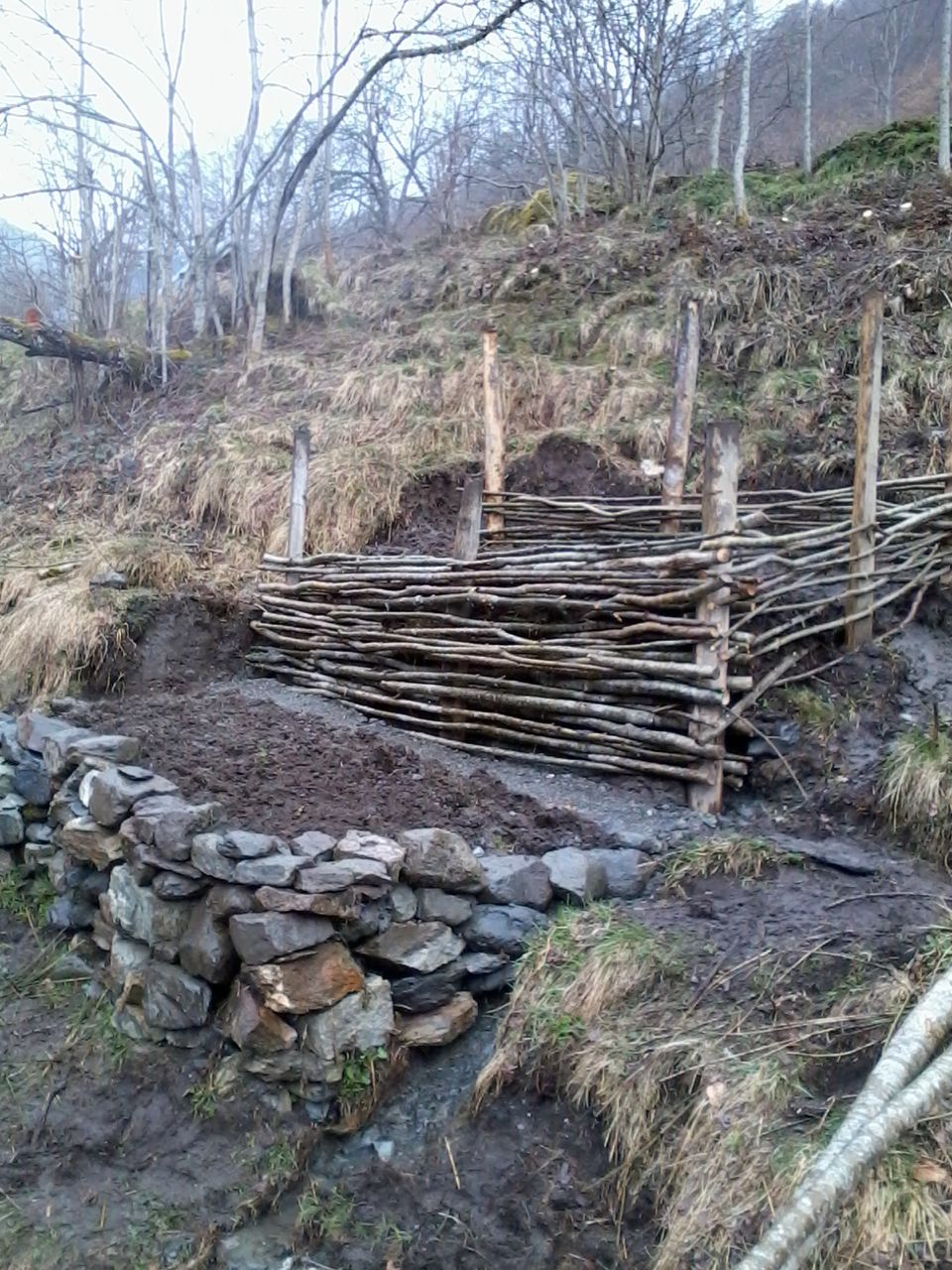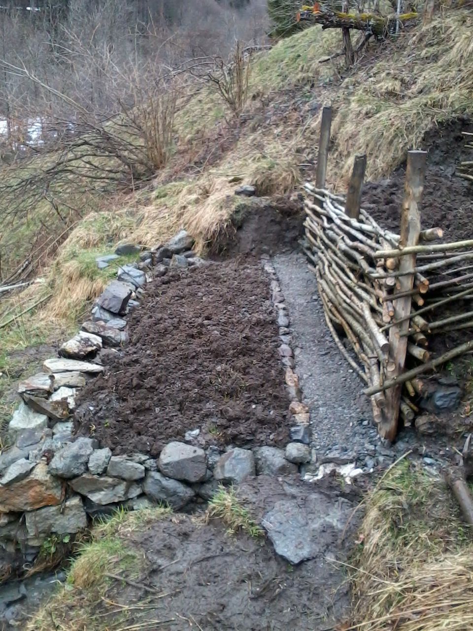 La deuxième terrasse est retenu par trois piquets en acacia autour desquels se tissent des longues tiges de frêne, appelés plessis. Ce système est beaucoup plus rapide à mettre en place que le muret en pierre, et je trouve le résultat plutôt joli. Au départ je me suis dis que c’était temporaire, que je le remplacerai par un muret en pierre, mais qui sait, c’est peut-être le muret en pierre qui se retrouvera remplacé par les tiges de frêne… à réfléchir !