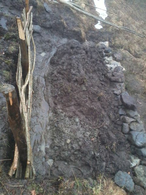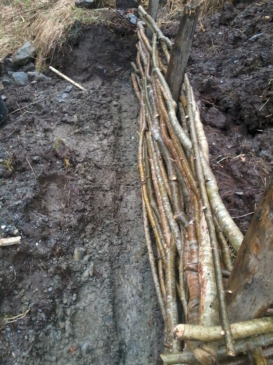 J’ai choisi cet emplacement pour plusieurs raisons : il est discret, caché derrière une ligne de saules et de noisetiers qui formeront la base d’une haie protectrice. Il est naturellement en terrasses : l’écoulement des eaux de ruissellement à tracé son chemin en zigzag en descendant la pente forte, creusant une sorte d’escalier naturel qui dessine une bonne base pour aménager les terrasses. Cela veut aussi dire, bien sûr, qu’il va falloir bien canaliser ces eaux pour éviter l’effet marécage qui pour l’instant domine, le transformant, j’espère, en système d’irrigation.
