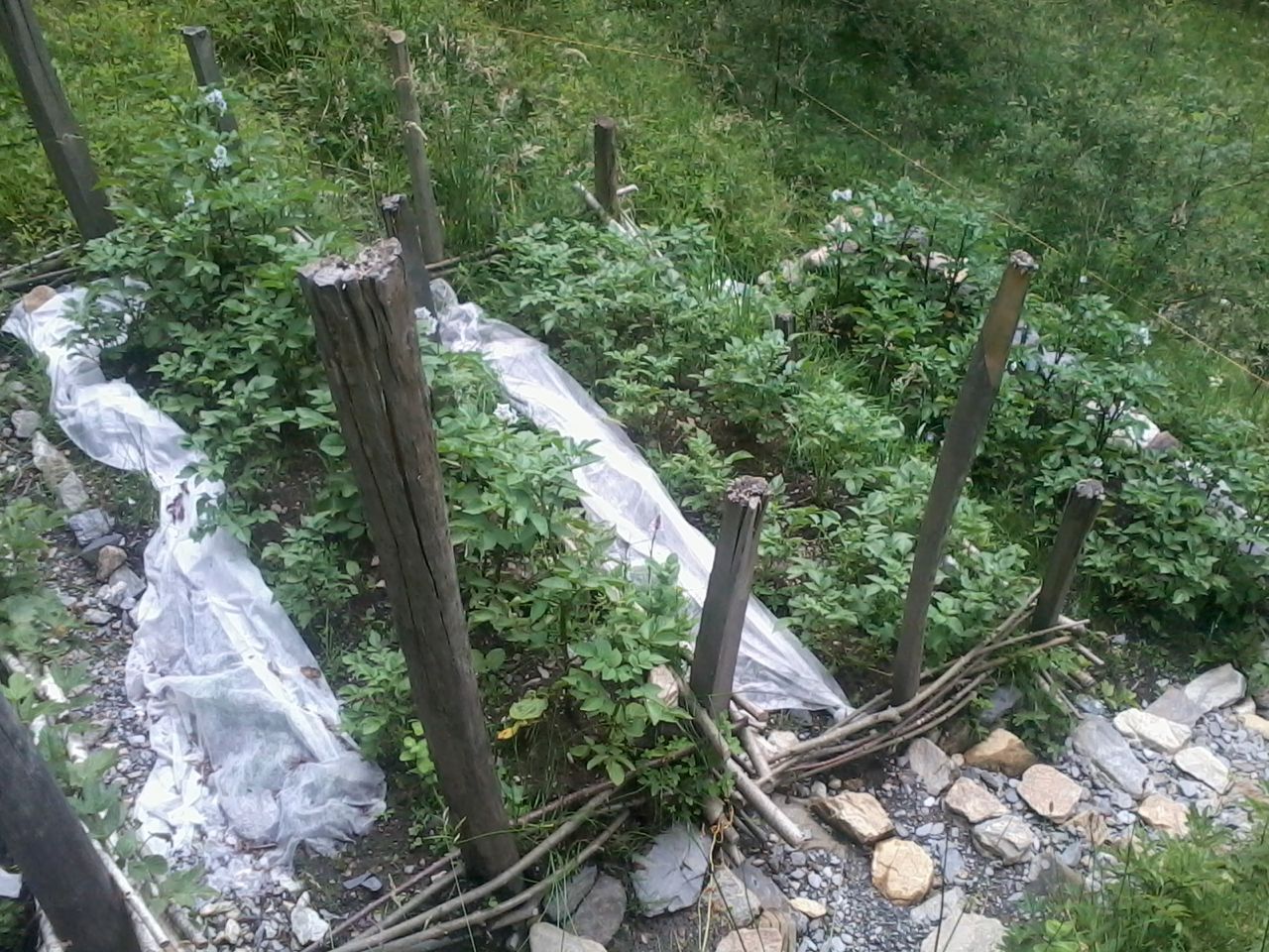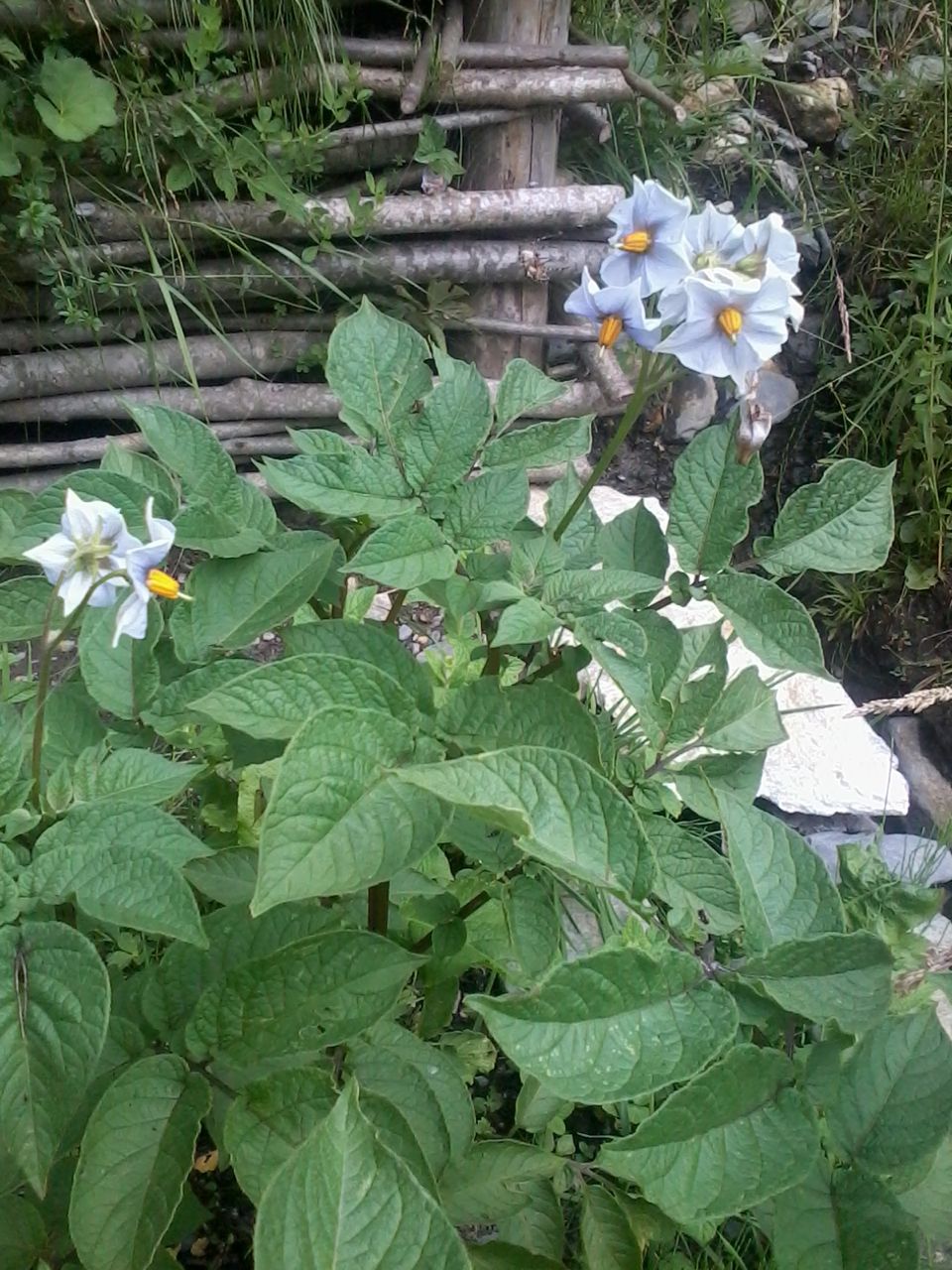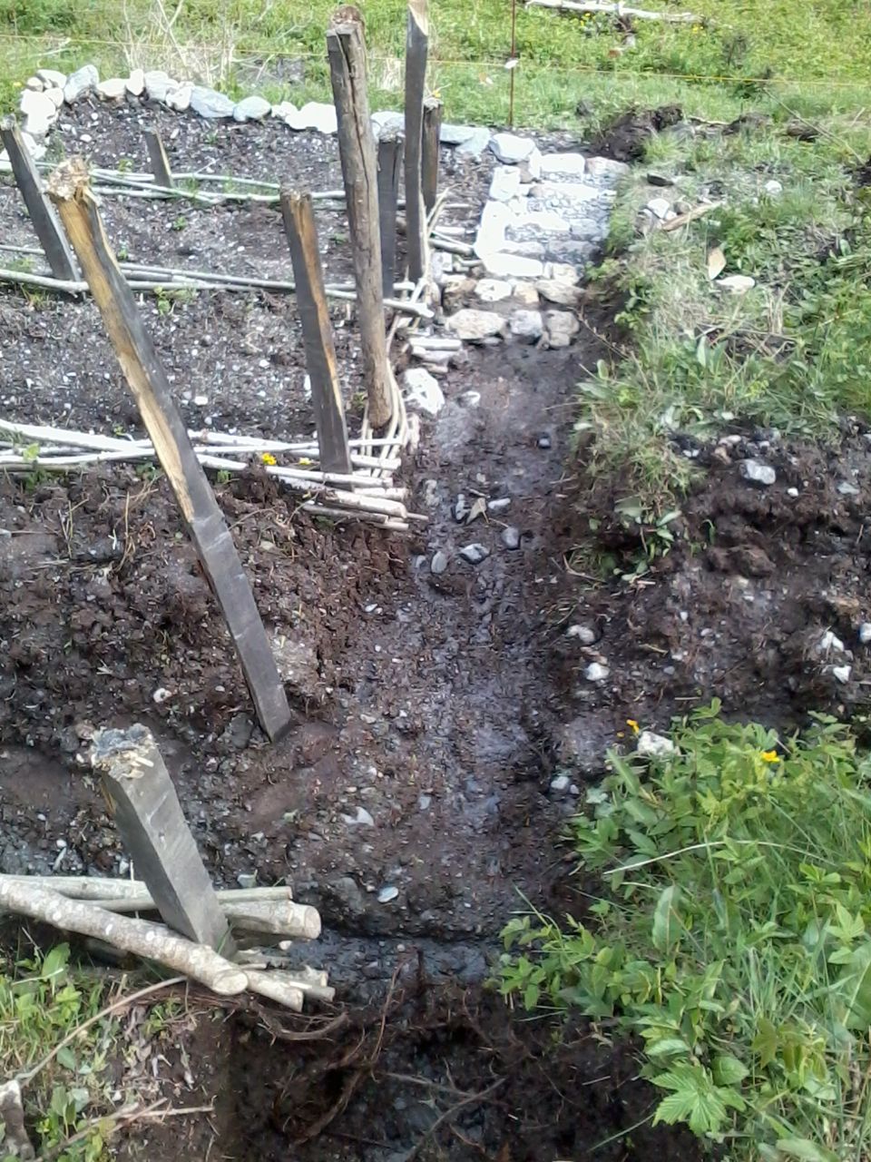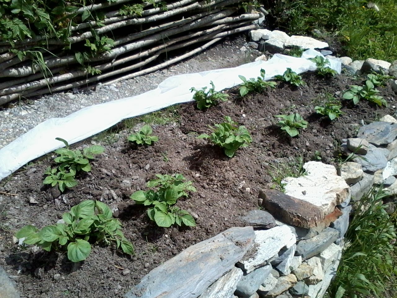 J’ai décidé de planter des pommes de terre à la fois pour préparer et aérer la terre en vue des plantations ultérieures, mais aussi pour ne pas avoir à trop m’occuper du potager cette première année vu que je passais déjà beaucoup de temps à le construire en plus du temps passé à construire la maison. Mais tant qu’à planter des pommes de terre, j’ai opté pour des variétés que je ne trouve pas au supermarché ! J’ai donc choisi des Cornes de Gatte (roses), et des Bleue d’Artois (bleues), qui ont l’air d’aimer l’air de la montagne.