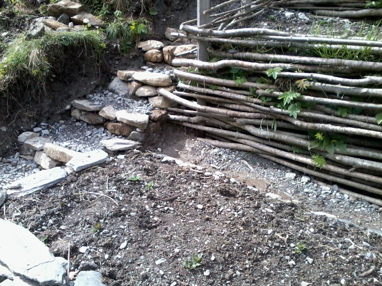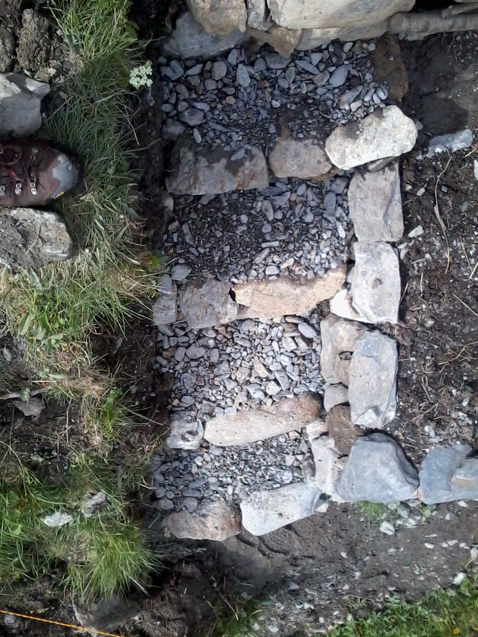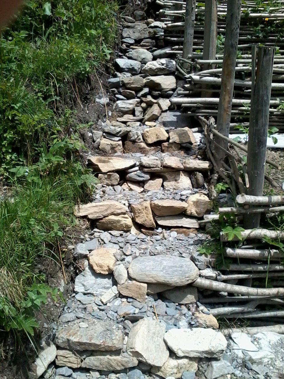 Pour construire les marches, j’ai creusé une tranchée descendant le long d’un côté des terrasses, empilé des pierres pour faire le bord avant de chaque marche, et rempli de gravier derrière pour élargir l’appui du pied.