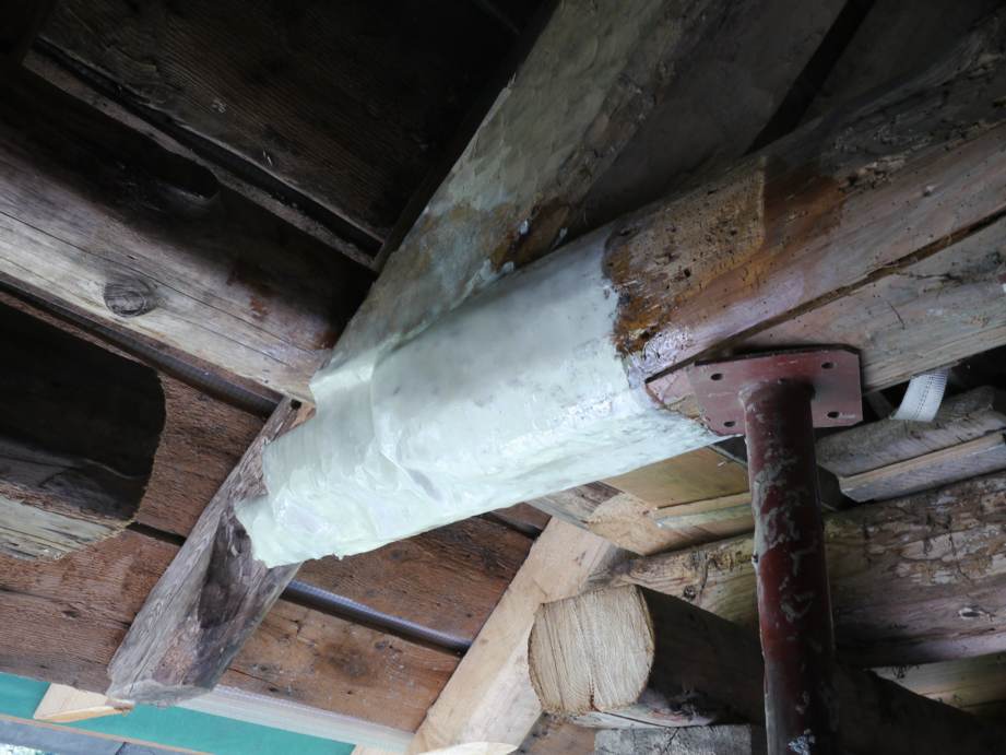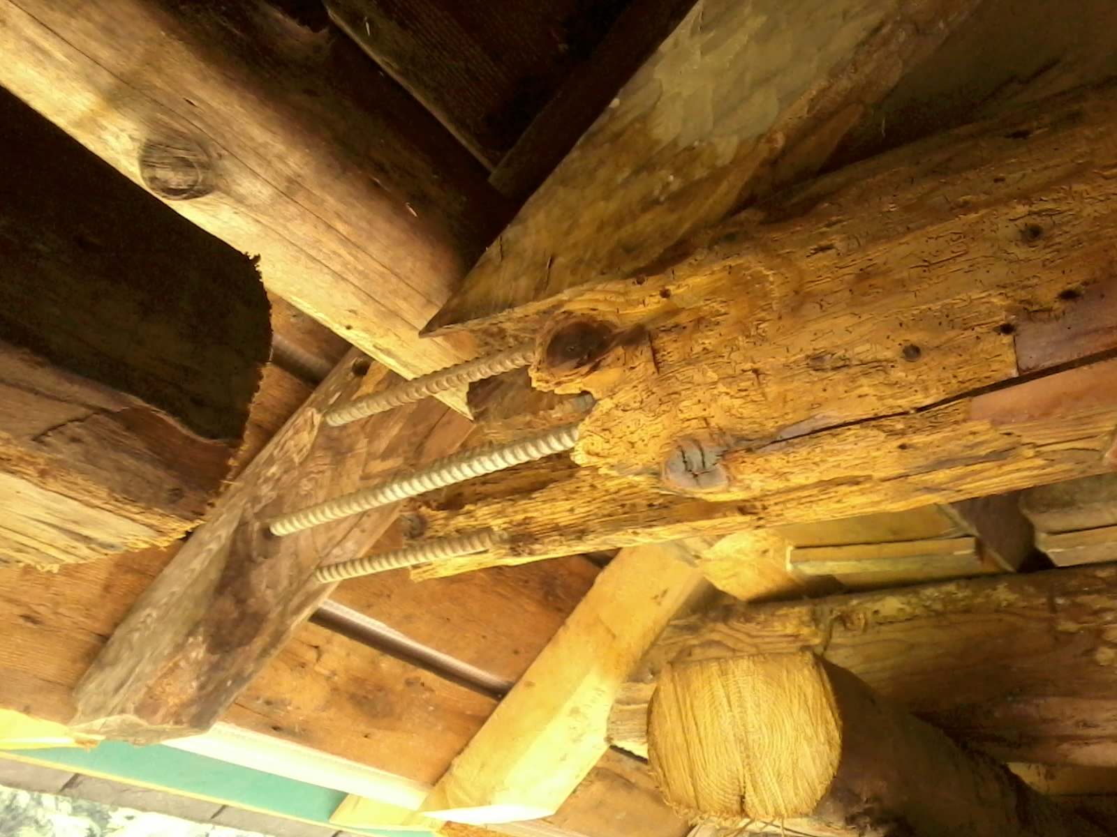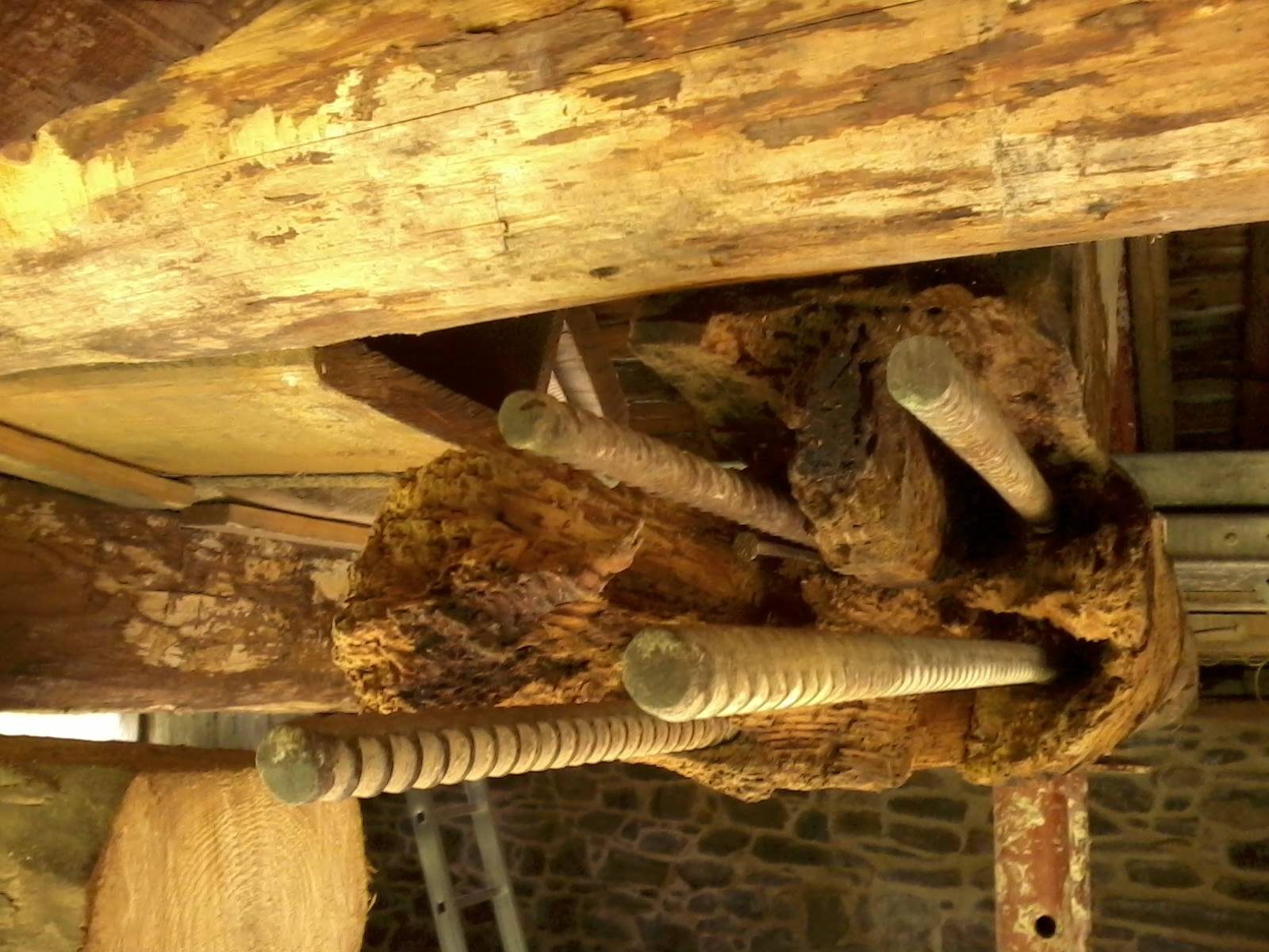 Une de de nos poutres, un entrai de ferme pour être précis a été complètement endommagé par une exposition prolongée à l’eau . Le bout de l’entrai est complètement pourri exactement à l’endroit où celui-ci repose sur le mur et à la jonction arbalétrier/entrai.