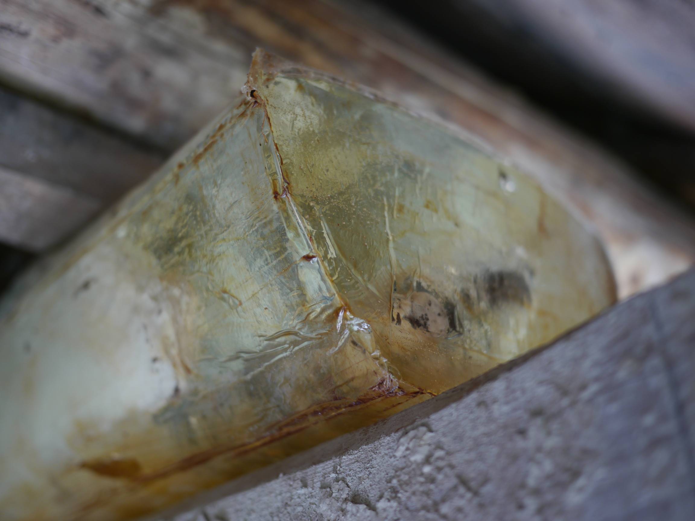 Pour retrouver la forme de la poutre j’ai ensuite réalisé un moule en carton couvert de scotch d’emballage et ciré dans lequel est coulé la résine epoxy d’inclusion. 7 litres de résine ont été nécessaires. Le moulage de la partie haute de la poutre n’est pas terminée mais les qualités mécaniques sont déjà largement suffisantes. Comme cette partie de poutre ne sera pas visible je ne vais pas continuer le moulage.