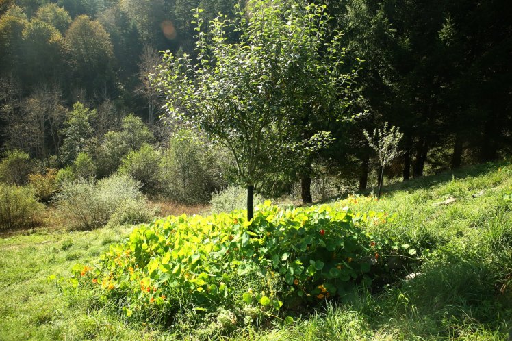 Les capucines -plantées pour attirer les pucerons et éviter leur prolifération sur les pommiers- et les fruitiers profitent aujourd’hui de ce système de géoépuration.