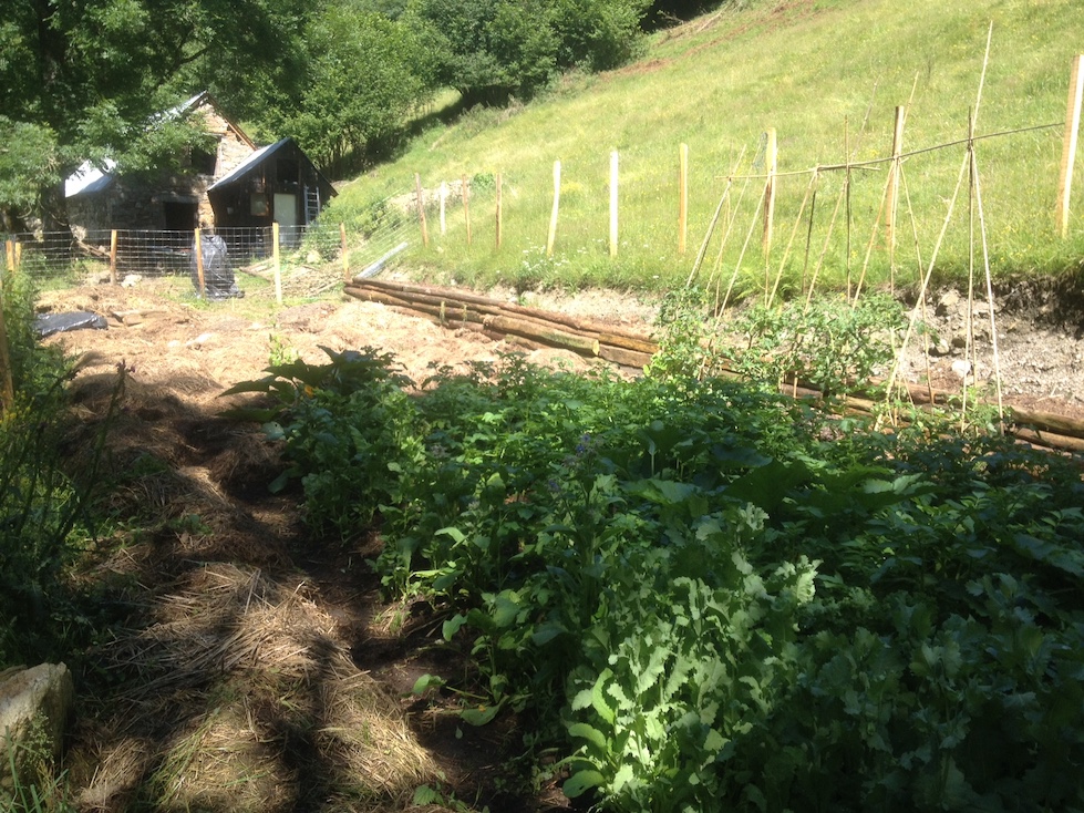 Le plan était donc de fabriquer petit à petit un sol adapté aux plants potagers, à partir des ressources in situ. De la terre de montagne, c’est à dire, la mince couche existante, heureusement travaillée par les taupes et les racines pivotantes des rumex et des sisymbres, ainsi que les infatigables racines des orties, et enrichie par l’éventail des espèces de nos étendus herbeuses : trèfle, gesses, lotier, plantain, achillée, millepertuis, ronce, thym serpolet, origan, et toutes les diverses graminées dont j’aspire à connaitre un jour les noms…